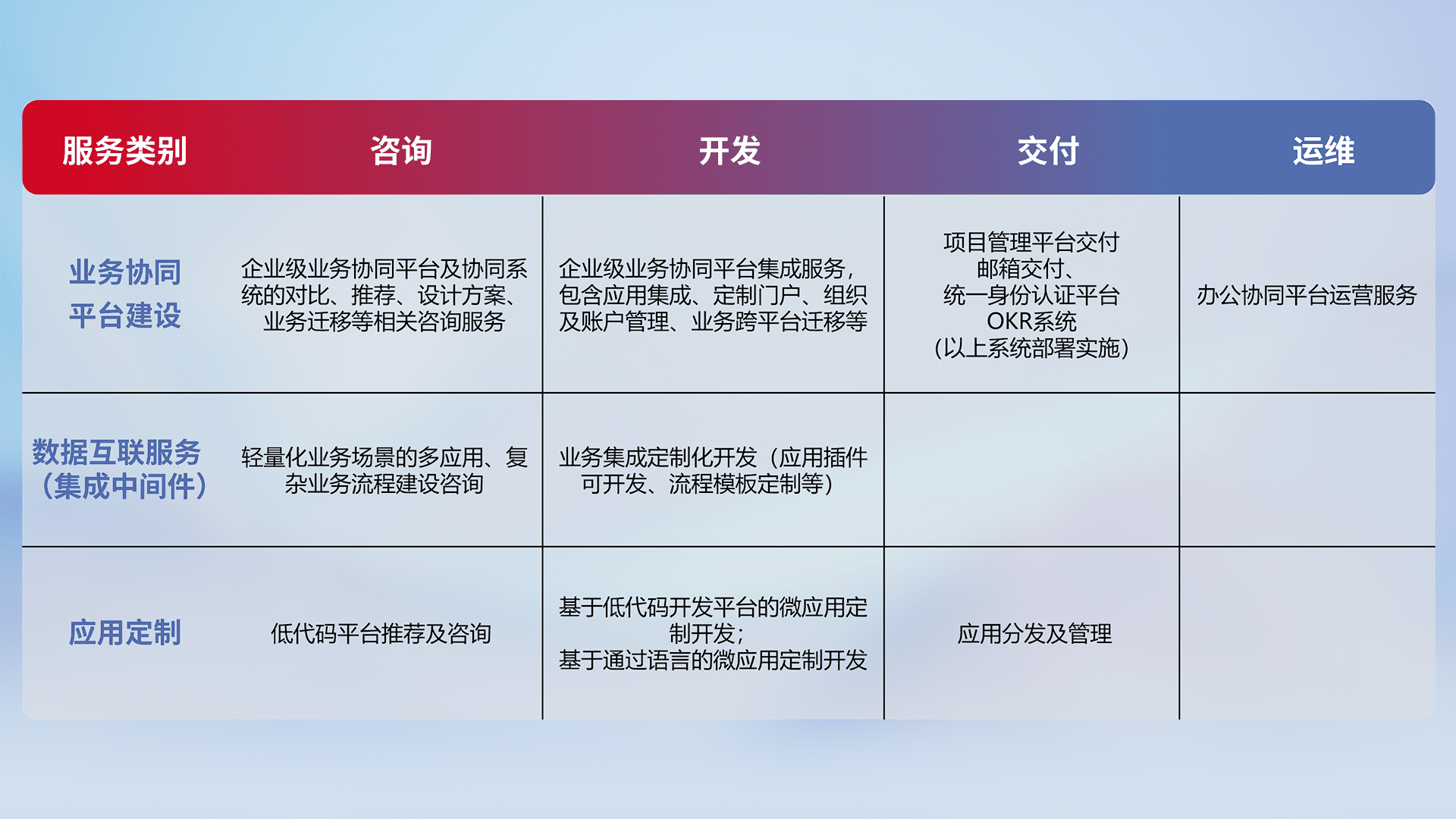 针对钉钉、、、企微、、、IDaas等平台级产品提供产品的规划、、方案、、、交付、、定制化开发等服务,,实现如统一协同办公、、、智能客户服务、、混合会议管理、、智能数据查询、、等业务场景,,,实现数字化转型。。。。