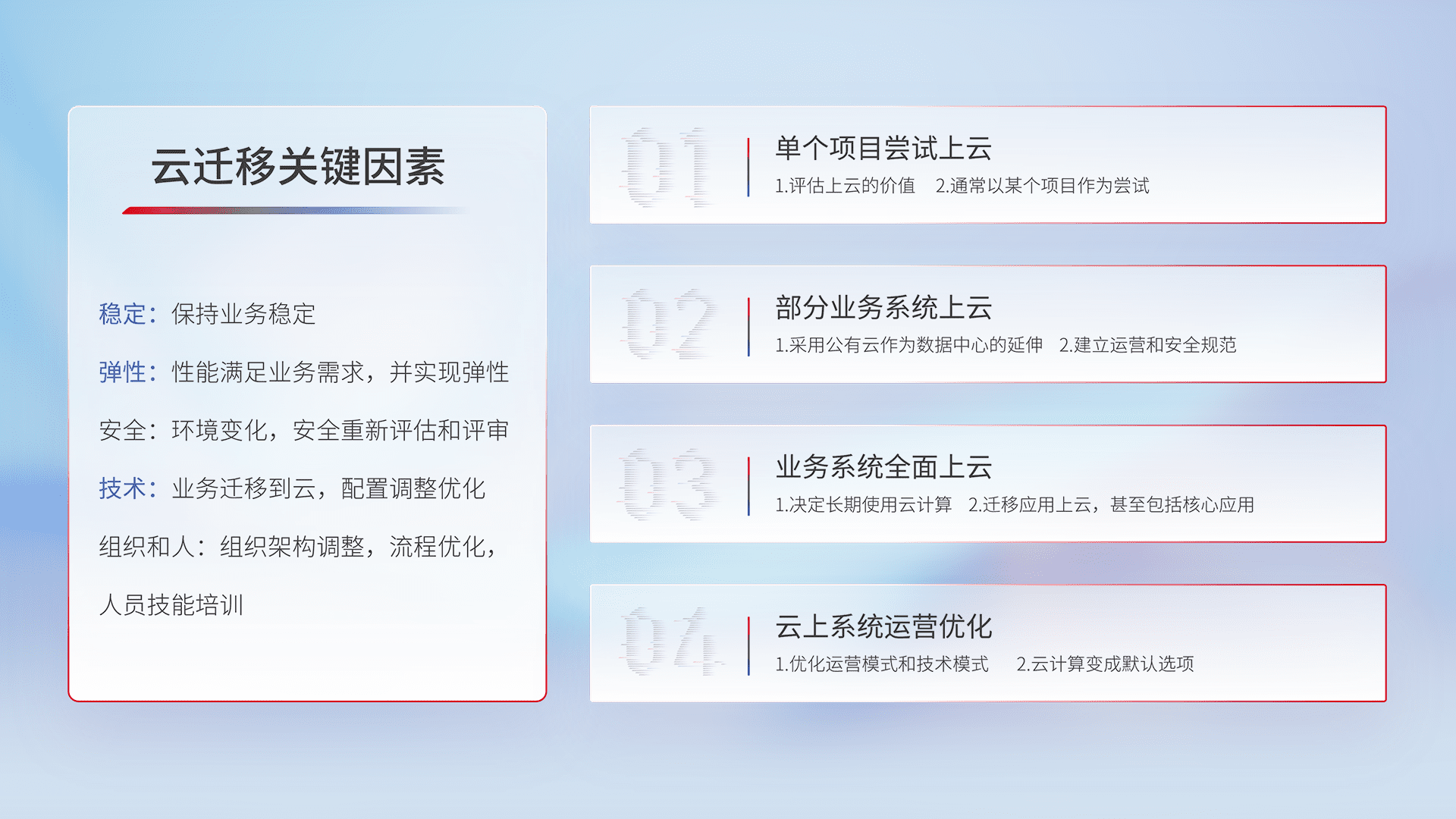 结合实际业务,,,,从规划设计、、、、云平台选型、、、云原生改造、、、数据迁移、、、、集成交付,,,,迁移全过程为客户识别最佳上云路径,,,做好风险识别管理,,,设计网络架构、、、、身份权限、、、、安全审计合规、、、、操作审计、、、、日志审计、、监控告警策略、、、多站点容灾设计等,,,对云上基础设施进行整体规划,,,,提升IT治理水平,,,,以满足弹性、、、高可用、、、高性能的需求。。。